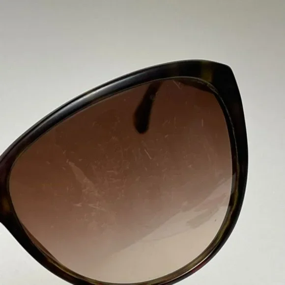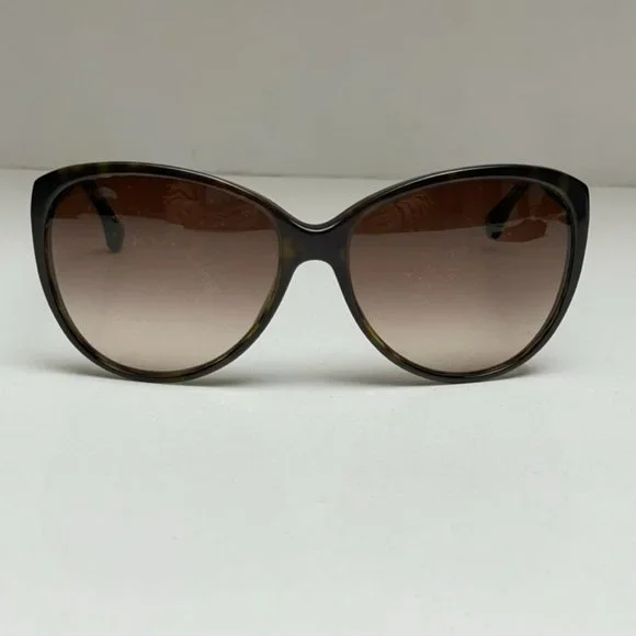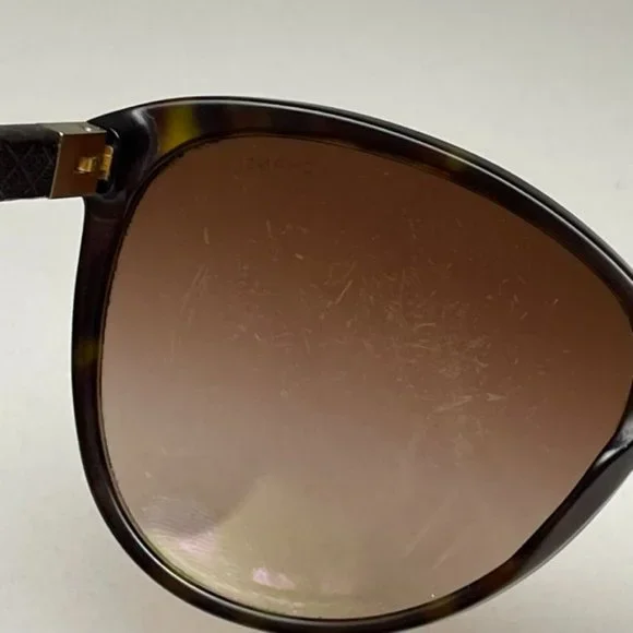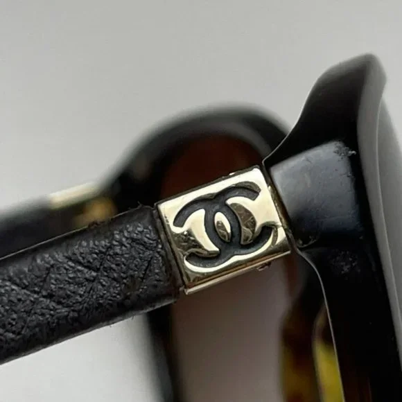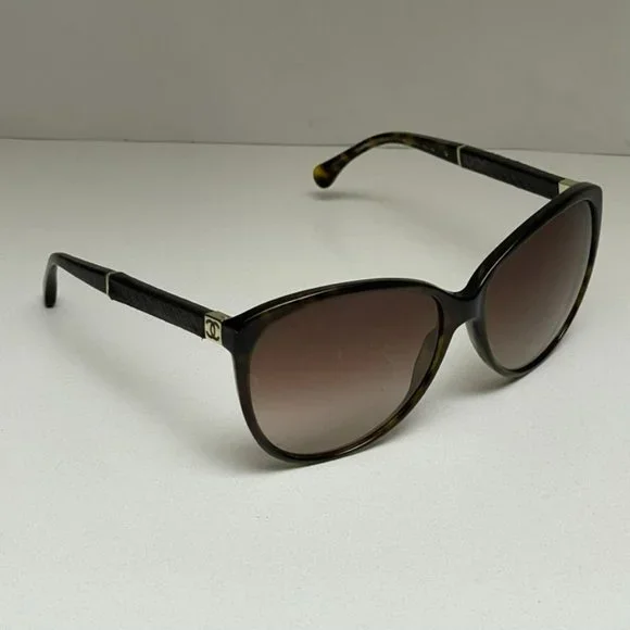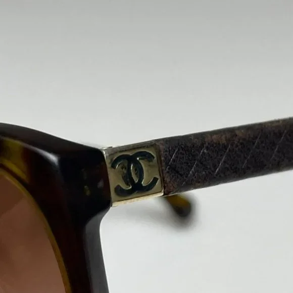 This is a gorgeous pair of Chanel brown tortoise frame cate-eye sunglasses with brown frames, logo CC, and quilted leather detail on sides.Designer: ChanelStyle #: 5225Color: Q 714/3B 58-15Size: 135Full Serial: 5225 Q 714/3B 58-15 135 3NStamp: Chanel Made in ItalyMeasurements: Frame Length: ”, Height: ”, Arm Length: ”Color: BrownMaterial: AcetateItem Condition: Pre-Owned: Fair.Exterior: Fair.Note: Comes with Box, Case, & Dry Wipe.Adore The Couture would like for our customers to remember that most of the items we carry have been previously owned. We carefully check each item before accepting them and make sure to include very detailed pictures and accurate written descriptions, so please check them very carefully and pay particular attention to the sizes and measurements. If you need additional photos, please email us and we will happily take requests.
